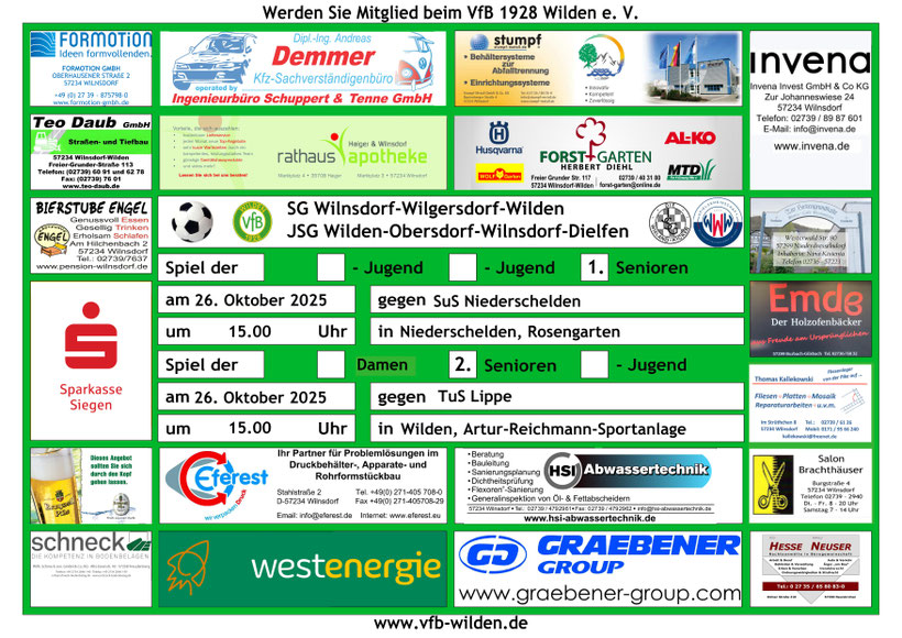 Am Sportplatz Wilden stehen auch noch weitere Werbeflächen zur Verfügung. Firmen, die Interesse haben, sich mit einer Werbebande am Sportplatz vorzustellen, können sich gerne an den Vorstand des VfB Wilden wenden (Mail: vfb-wilden@gmx.de, Tel. 0160/4022138).