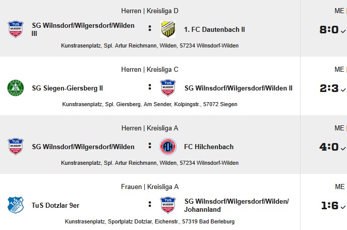Mit 3:1 entführte die SG Wilden/Gilsbach überraschend, aber völlig verdient alle 3 Punkte aus dem Wilnsdorfer Wieland-Stadion. Dabei geriet die SG in der 16. Min. zunächst in Rückstand und tat sich dann schwer, Offensivaktionen herauszuarbeiten. Es dauerte bis zur 45. Min., bis Julian Emde nach einem öffnenden Diagonalpass von Thomas Klöckner über die gesamte TuS-Defensive hinweg den Ball annahm, noch 5 m lief und dann unhaltbar halbhoch ins Wilnsdorfer Netz traf. In der 2. Halbzeit lieferte die SG eine bärenstarke Partie ab und bewies enorme Zweikampfpräsenz. Jetzt klappte es auch offensiv deutlich besser und immer wieder wurden Angriffe gefahren und Standards herausgeholt. In der 74. Min. kam Mehmet Sukapan am 11-m-Punkt an den Ball, schob überlegt an Max Remmel weiter, der die 2:1-Führung erzielte. In der 74. Min. zog Thomas Klöckner einen Freistoß so scharf auf das Tor, dass der Wilnsdorfer Torwart nur hochfausten konnte, Christian Stahl schaltete am schnellsten und drückte den Ball zum 3:1 über die Linie. Die starke Teamleistung der SG wurde von den mitgereisten SG-Anhängern lautstark mit dem Wilden-Gilsbach-Echo honoriert. Ein Sonderlob hatte sich der Wilnsdorfer Torwart verdient, der mehrfach stark parierte. Ebenfalls hervorzuheben war die sehr ruhige, in der Ahndung konsequente und insgesamt ausgewogene Leistung von Schiedsrichter Bertucci. Die SG verbesserte sich mit dem Erfolg auf Rang 3 und konnte am über die gesamte Saison sicher stark einzuschätzenden Nachbarn TuS Wilnsdorf/W. zunächst vorbeiziehen.